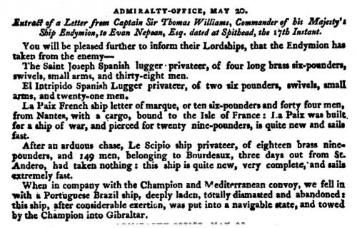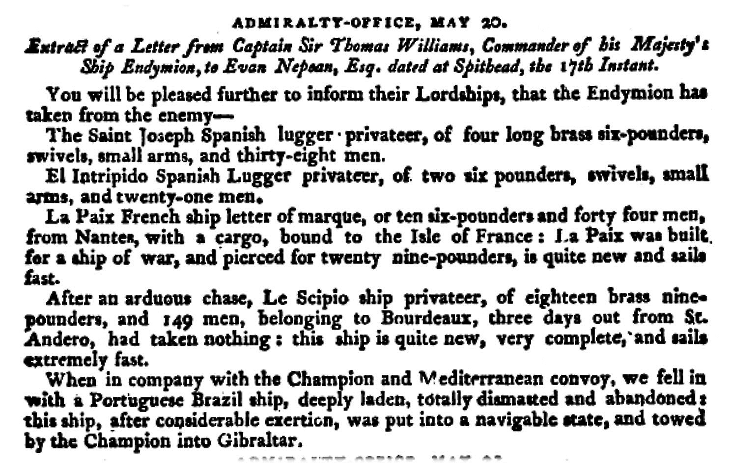 As captain of the Laconia, Wentworth could expect his success off the Western Islands to be published in the same source and read by Anne Elliot. News of naval battles and prize taking was not confined to the Chronicle and Gazette. At Ashe Park, Jane Austen read of Frank’s capture of a Turkish ship in the paper belonging to her neighbor Mr. Holder and wrote to Cassandra at Godmersham Park, “You will see the account in the Sun I dare say” (8–9 November 1800). The report came three months behind the event, so it is likely that Mr. Holder’s was a local newspaper. The London Gazette made no mention of this particular exploit; neither did the Chronicle, perhaps because the Turkish vessel was deliberately destroyed to prevent its cargo falling into enemy hands. In the summer of the same year, the Chronicle published a letter written by Sir Thomas Williams, Lieutenant Charles Austen’s captain on the Endymion, itemizing the prizes taken that spring (3: 498). The proceeds from one of these prizes—and there were several relatively minor captures that year—paid for Jane and Cassandra’s topaz crosses and gold chains.