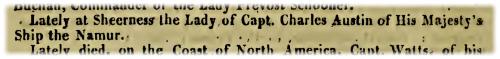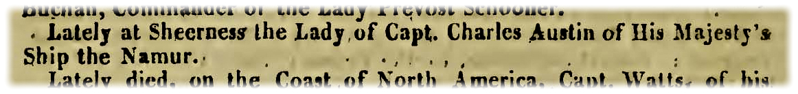 Jane Austen drew on her own knowledge of marriage announcements in the newspapers. Searching the press in 1815 for news of an acquaintance’s marriage, she wrote to a niece, “I have never seen it in the Papers. And one may as well be single if the Wedding is not to be in print” (?late February–early March 1815). Notice of her brother Frank’s union with Mary Gibson on July 24, 1806, was recorded in the August edition of the Chronicle (16: 175), but Austen would have looked in vain for her brother Charles’s marriage to Frances Palmer in Bermuda on May 18, 1807. It was not recorded in the national or local papers, the Chronicle or the Gazette, although naval marriages in Nova Scotia and Newfoundland were reported. Sadly, Fanny’s death on September 6, 1814, was among the Chronicle’s October obituaries (33: 352).