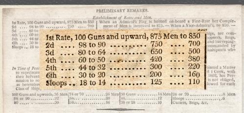 Which particular version of the list the Musgroves consult on this occasion is not specified, but Steel’s is the most probable, given that the official Admiralty list named ships but did not specify rate and class. The rate depended on the number of guns and men carried, so first rate ships had 100 guns and from 850 to 875 men; second rate 98 to 90 guns and up to 750 crew; and so on, down to unrated sloops with a maximum of 18 guns and 125 men.