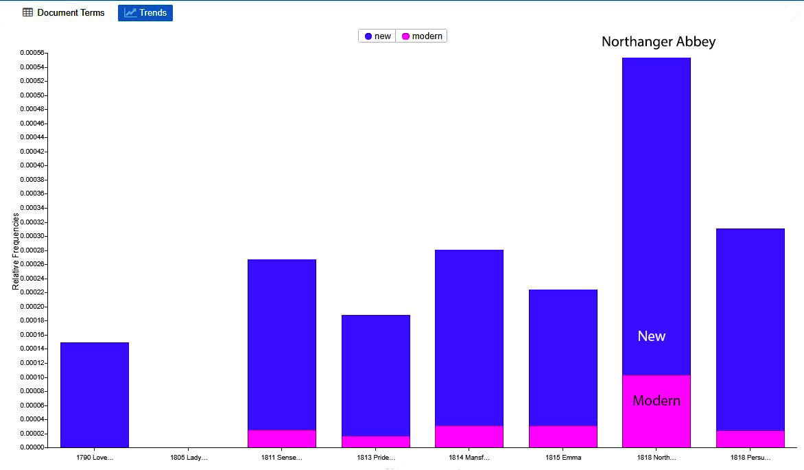 In fact, Austen uses the words new and modern more often in this book than in any other. Voyant Tools visualizes the relative frequency of usage of the words modern and new in Austen’s longer works. In Northanger Abbey, the two words appear far more often relative to other words than in any of the other works. For Jane Austen, Northanger Abbey was therefore very much a book about newness and modernity, as her vocabulary reveals.