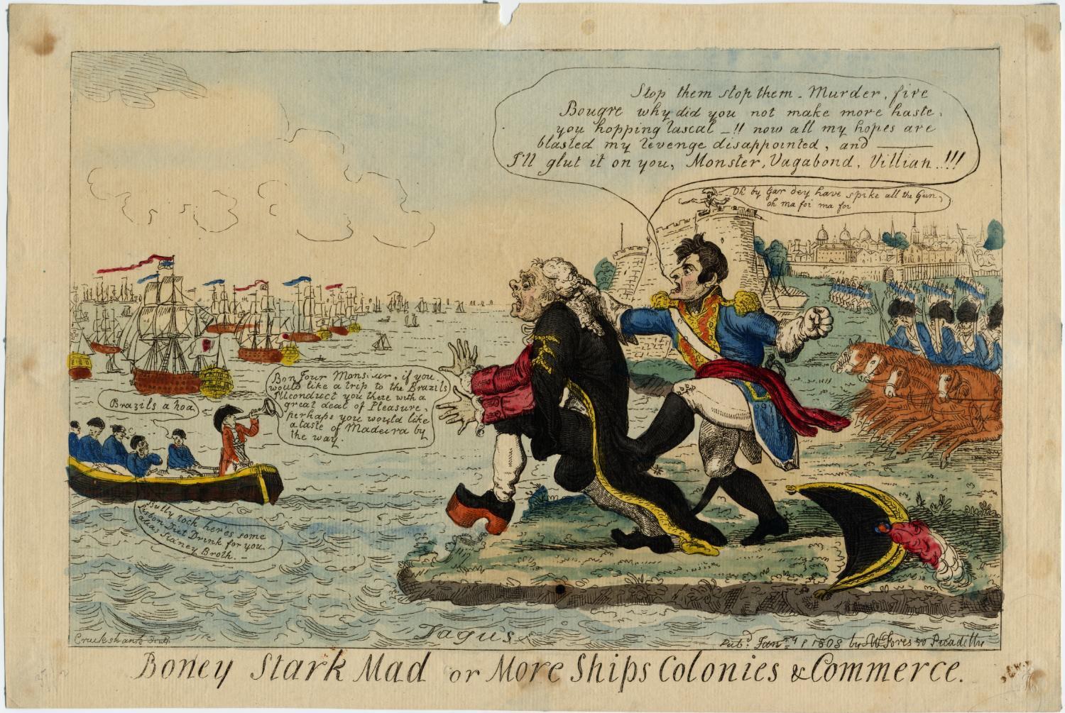 A British soldier mocks Bonaparte, inviting him to Brazil. “Stark Mad” at General Junot (in black) for arriving too late in Lisbon, Boney yells, “Stop them!” (1808)