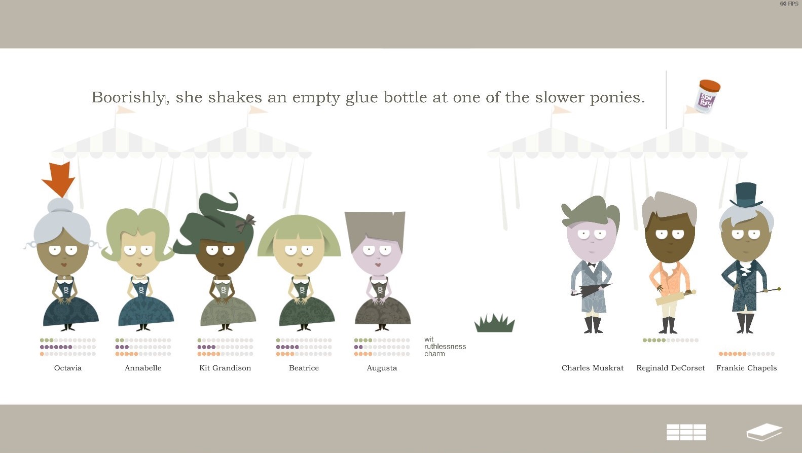 Despite not being an explicit adaptation of Austen’s work, The Lady’s Choice (2016) is very much indebted to that author. It is (at the time of writing) the most visually diverse of any Austen-inspired game we have encountered. This diversity perhaps goes hand in hand with the way it is described by its designer: “Though it is a historical visual novel, it’s not going to be completely accurate (for example, they didn’t really have a Season in Bath). I have taken liberties because, well, I wanted to have fun with this rather than freak about every nuance of historical accuracy.”