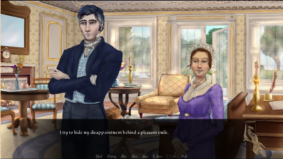 Truths Untold (Crow Tree Entertainment 2020– ), for example, the player names and controls Miss Fernside, who is returning with her parents from an extended trip to the Continent. The Fernsides were investigating the fate of Mrs. Fernside’s first husband, an aristocrat presumed dead during the French Revolution. With the help of family friend Mr. Silas Worthington, the Fernsides discovered that her husband lived much longer than expected, rendering the Fernsides’ marriage bigamous and Miss Fernside and her brother illegitimate. While they are able to keep this information secret, their lengthy trip abroad has led the neighborhood to assume that Miss Fernside was concealing a pregnancy, fathered either by boy-next-door Mr. Guy Linfield or Worthington. To refute the assumption would require revealing her equally damning illegitimacy, destroying her brother’s prospects as well. While Miss Fernside can choose to be “demure,” “composed,” or “rebellious,” her choice is a reaction to plot points she doesn’t control.