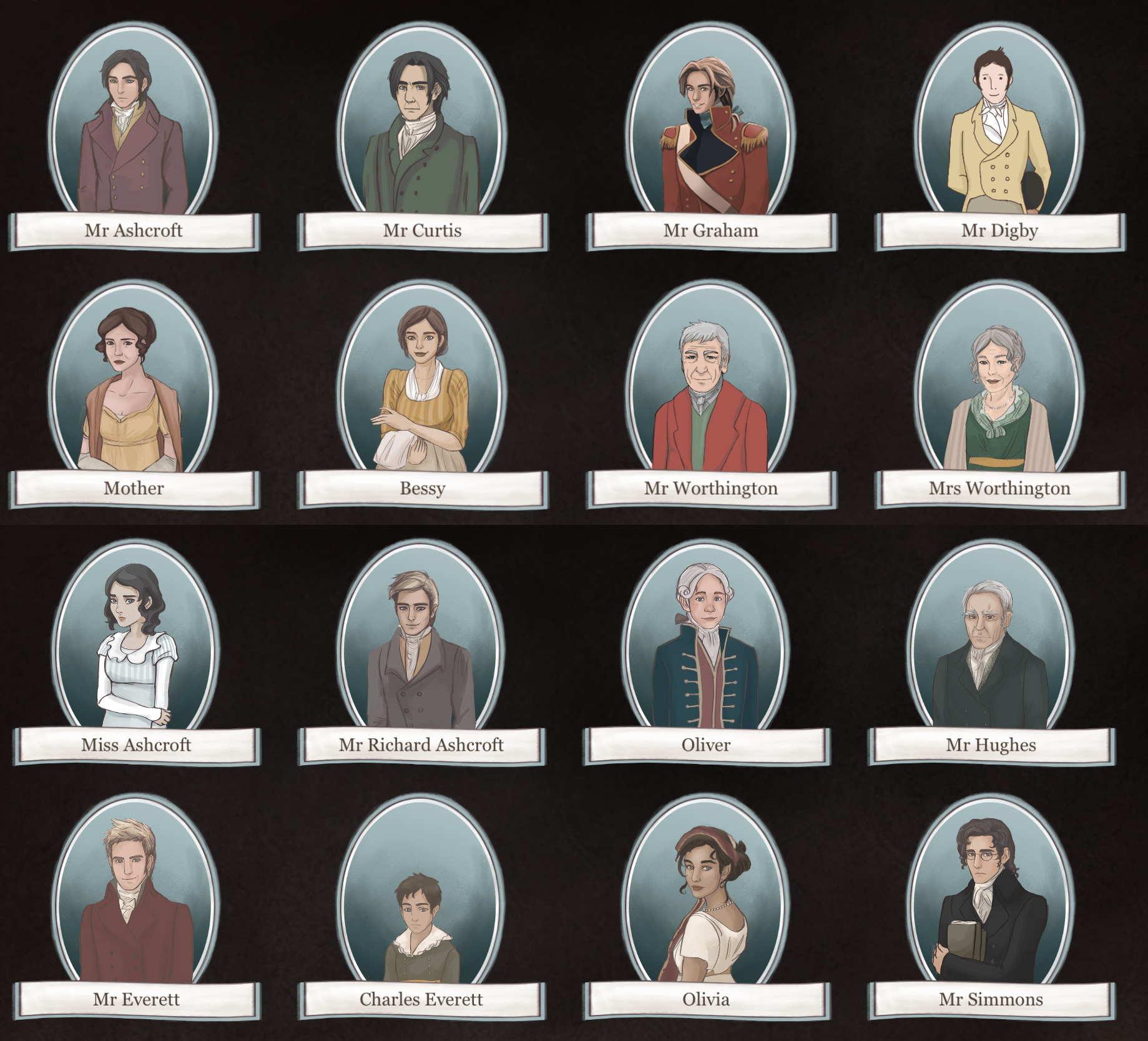 Regency Love (2015– ), a mobile game for iOS, possesses, to the best of our knowledge, the only development team to have presented at the British Society for Eighteenth-Century Studies (BSECS). Players interact with a variety of characters, and choices impact the player’s attributes—dutiful, compassionate, spirited, sensible, or gentle. Through minigames of Austen trivia, the players also improve their “accomplishments” in the areas of dancing, drawing, music, needlework, reading, and riding. These choices affect the ultimate ending of the game and how the player character feels about that ending. The suitors are heavily influenced by Austen characters: Mr. Ashcroft, a wealthy landowner and protective older brother strongly resembles Mr. Darcy, while Mr. Graham’s look and plot seems inspired by Colonel Fitzwilliam. Most strikingly, Mr. Curtis’s appearance is clearly based on Alan Rickman in the 1995 film adaptation of Sense and Sensibility. The last, Mr. Digby, is the default suitor who will always propose marriage, regardless of how you treat him. Designed to look more cartoonish than the other characters, he is a comedic character frequently ridiculed, drawing to mind more harmless and less pretentious failed suitors in Austen’s novels. As with many of the indie games we explored, this game hopes to be expanded with additional romantic options. Despite close female friendships in the current iteration of the game, all the romance options are mixed sex, but in an expansion to a London setting, the development team wishes to include the possibility of a same-sex relationship.