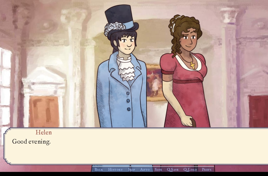 The games we play rarely come from a major studio. Made by independent developers fueled by a love of Regency culture and Austen, these games are aimed at overlooked groups of gamers (including but not limited to women) and showcase their creators’ technical, artistic, and literary skills. Much like Austen’s “bit of ivory,” this wave of games is “small” by the standards of the game industry, but the games are often carefully and beautifully wrought. It is important to note that these games are often created by a tiny handful of people, if not a single creator. They are generally labors of love, not big-budget commercial media ventures. Meanwhile, they are under more structural pressure to be narratively capacious, with scripts that can swell to tens of thousands of words to cover all the narrative options, dialogue variations, and the like. What we have focused on here—the visual impact of character design—is often the costliest component for a new game designer. It is thus not terribly surprising that even in ambitious and progressively minded games, there is a limit on what can be offered. That said, we hope to see still more depth of representation—in image and text—in games in the years to come.