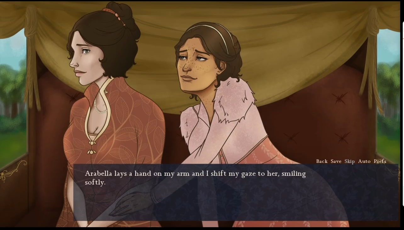 Screenshot of gameplay from The Lady’s Choice: heroine and Arabella in a carriage