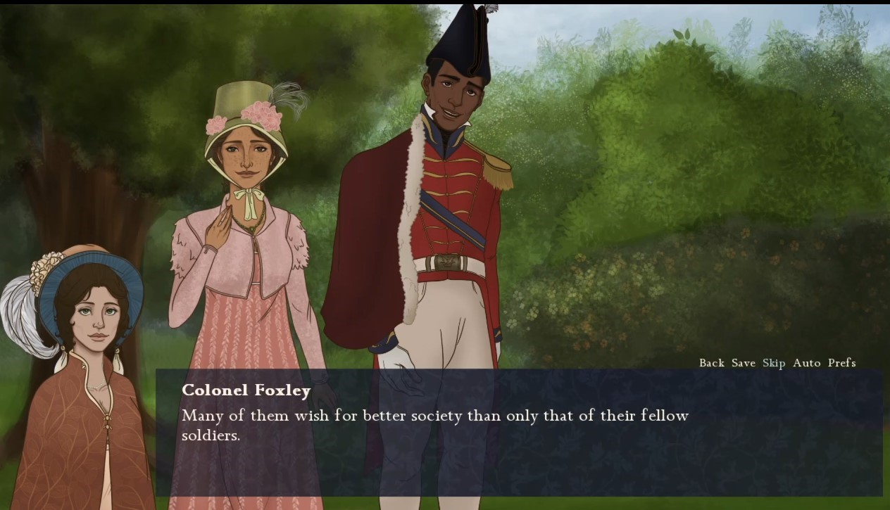 The Lady’s Choice features several characters of color: Arabella’s love interest Colonel Foxley is a Black military officer, with close-cropped hair and a gentle affect. In her review for gaming website Kotaku, Gita Jackson noted that she “gasped audibly in the office” when Foxley was introduced. Under the screenshot of his character, her caption read, “You can’t date him and I’m so upset.”
