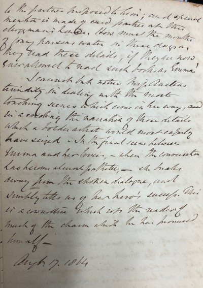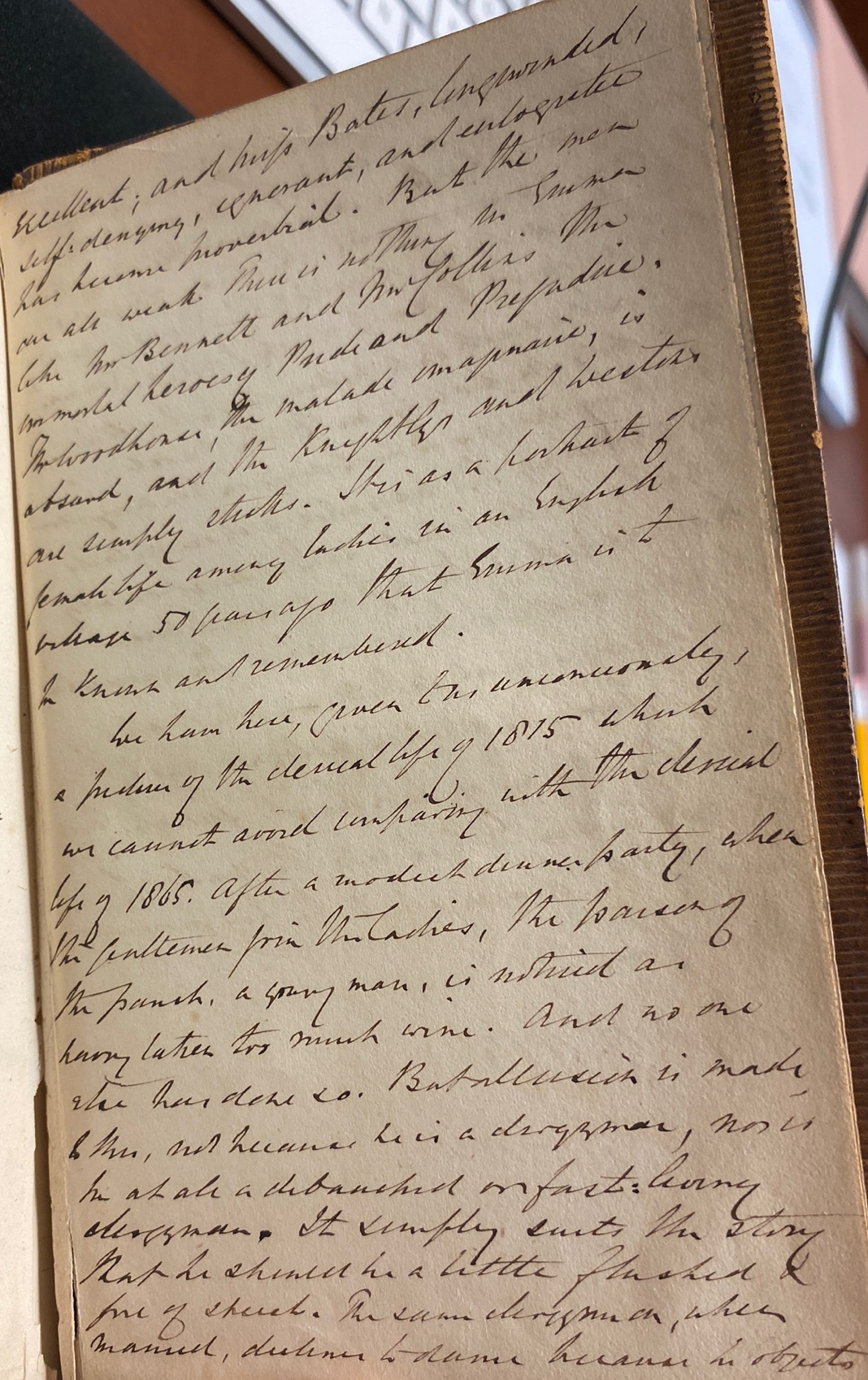 Anthony Trollope’s admiration for Jane Austen is well attested. Among the proofs are Trollope’s own set of Austen’s novels, which have survived and are at Princeton University Library.15 Trollope wrote a lengthy note on the endpapers of his copy of Emma, which was published in 1949 by Bradford Booth. Another transcription appeared in Nicholas Shrimpton’s 2014 Oxford World’s Classics edition of Trollope’s An Autobiography and Other Writings (231–32). There are errors and omissions in both versions, the most significant being the fourth leaf, which has been completely omitted in both cases. Princeton University Library has kindly granted permission for digital photographs of Trollope’s note to appear below. The photographs are preceded by a transcription that identifies departures from Booth and Shrimpton. The library was also able to confirm that this annotation is the sole one in the set, the other volumes being clean.