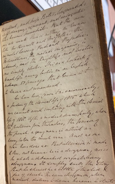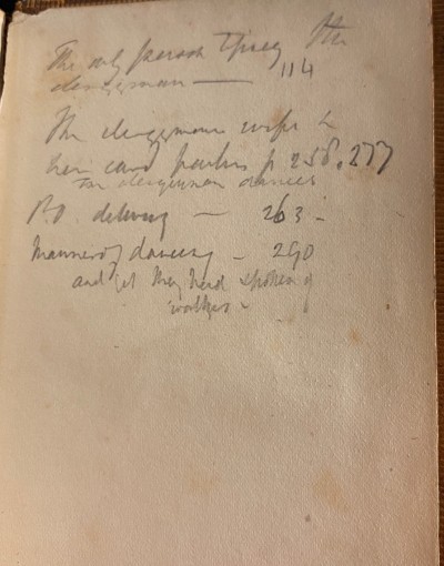 The only person tipsey the clergyman ———— 114 The clergymans wife & her card parties p 258.277 The clergyman dances PO delivery —— 263 – Manner of dancing – 290 and yet they had spoken of ‘waltzes’ – |