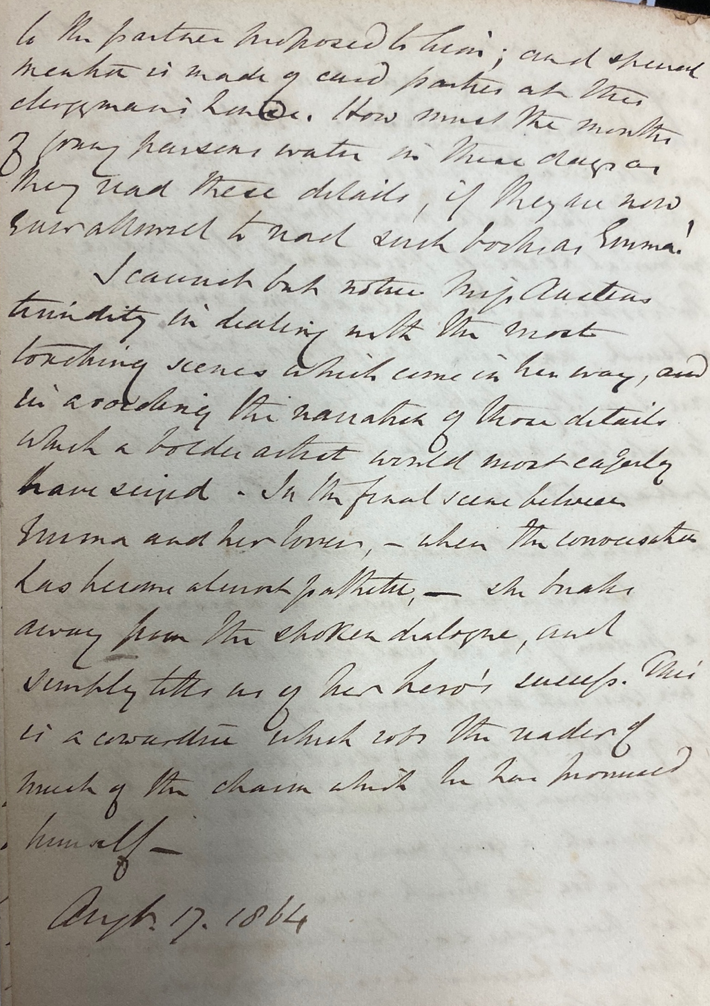Miss Austens timidity in dealing with the most touching scenes which come in her way, and in avoiding the narration of those details which a bolder artist would most eagerly have seized. In the final scene between Emma and her lover,—when the conversation has become almost pathetic,—she breaks away from the spoken dialogue, and simply tells us of her hero’s success. This is a cowardice which robs the reader of much of the charm which he has promised himself.