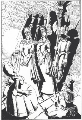 Another contrast—this time between two pictures rather than within one: frivolous Sir George Lesley pursues the pleasures of London and a randy dog in the foreground does the same (a trick I steal from Hogarth); at the other end of the kingdom his new wife first meets her stepdaughters in their remote castle. They meet by candlelight, you see, so I can employ chiaroscuro, like Caravaggio and Rembrandt, no less! She calls them “‘two great, tall, out of the way over-grown, Girls, . . . Scotch Giants’” (22). They call her “‘an insignificant Dwarf’” (20). The little Lesley niece is there, and to avoid sentiment I depict her as mischievous and brattish, sticking out her tongue and making a rude gesture. And please don’t miss the mouse with its grotesquely enlarged shadow!