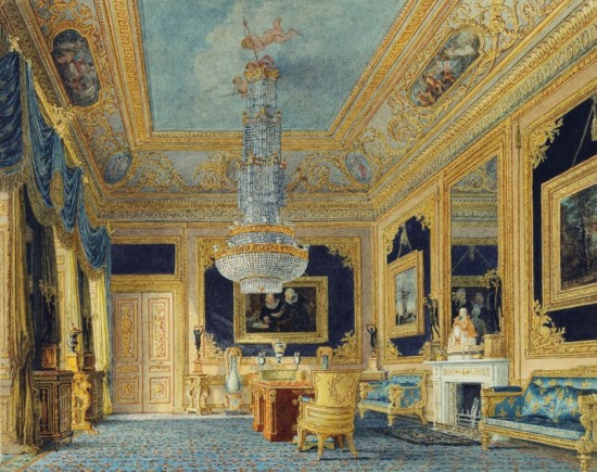 In the middle, the Nash design created a new space, which has no access to windows and therefore has to be top-lit, which is absolutely suitable, because this space is used as a picture gallery, which needs the light coming down from above. This picture gallery, which runs the entire length of the palace, is still there, though unfortunately the ceiling has been changed. There George IV hung a collection of paintings that he had formed in the previous years and that had previously been hung or housed at Carlton House. Another pleasure, the pleasure of art, is being celebrated in the heart of the palace.