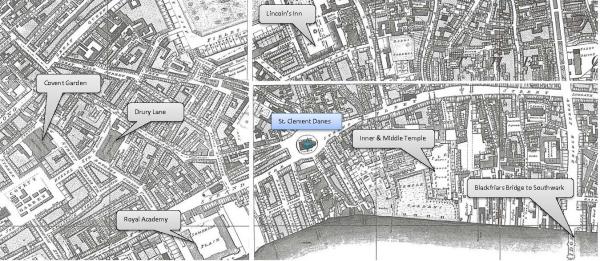 Map of London with St. Clement Danes and St. Clement Eastcheap.