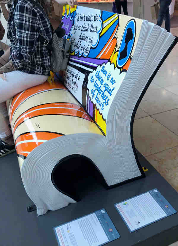 In a vein similar to Beyond the Birdcage, Female Power’s Matisse-like, brightly dressed woman sits writing a trail of pages. Although viewers will not likely see this black-haired, broad-shouldered woman as Austen, the plaque says that the “colourful BookBench depicts Jane Austen working at her desk—never ending paper and colours that reflect her strength and the vibrancy of her ideas.” The plaque also clarifies the bench’s title and argument: for women, writing is power.
