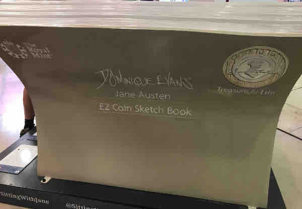 If we can imagine the Sitting with Jane benches representing the temporal categories of past, present, and future, the bench that best represents Austen’s past, her 2017 “currency,” and her literal future is There is No Doing without Money. Of all the benches on the Sitting with Jane trail, this one is certainly the most contemporary, even visionary, for it captures an artist’s work-in-progress as well as the recognition Austen has received in her placement on British currency. This bench includes details from Dominique Evans’s sketches for the Royal Mint’s new £2 coin. While Evans eventually decided that the famed Austen silhouette, Regency-era wallpaper, and Austen’s signature would be the design stamped on the coin, the bench shows many more sources of inspiration. Besides the actual sketches for the coin and even an embedded medallion replica, a version of the 1870 copy of Cassandra’s drawing of Jane appears on the bench, as do a peacock, a butterfly, and a series of descriptive words and phrases, including Northanger Abbey’s “there is no doing without money.” Like the recently released £10 banknote, which features a sentiment on reading uttered by Caroline Bingley, this bench’s title reads as ironic in its use of Isabella Thorpe’s crass commentary to hail Austen’s appearance on English money. Perhaps this irony speaks to Austen’s satirical style, as Bank of England Governor Mark Carney explained after delivering his July 18th speech at Winchester Cathedral introducing the new bank note. After all, one of the things fans love about Austen is how she critiques her characters to expose both their individual flaws and problematic societal norms.
