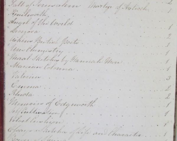 The likelihood of the countess having read Emma in 1820 is substantiated by her inclusion of it on a 141-item list of books on the back pages of the diary volume she began on September 1, 1819. Apparently drawn up in preparation for the Dalhousies’ move to Quebec in June 1820, the list includes the number of volumes per title: “2” in the case of Emma. While the list begins in alphabetical order, the last third of the entries are not alphabetized, implying that the countess added those latter entries in the order in which she acquired the books. Several of the titles surrounding Emma can be cross-referenced with the countess’s diary entries from June 1820 to November 1821.