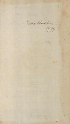 The first volume of this eight-volume work by Oliver Goldsmith (1728?–1774) is inscribed “Jane Austen 1799,” written when Jane Austen was twenty-three. All of the volumes have the bookplate of James Leigh Perrot, Austen’s maternal uncle, and were probably given to Austen by him with other books when she was visiting Bath in May and June of that year. There are very few books that Jane Austen is known to have owned. David Gilson lists twenty in his 1997 Bibliography (436-46). This volume is from the collection of Geoffrey Keynes.