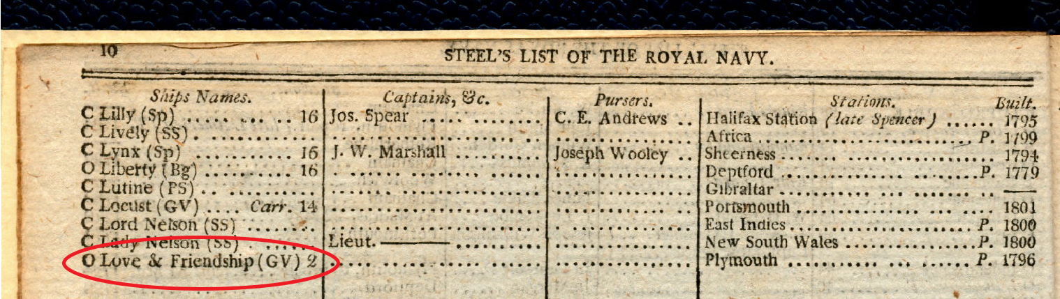 Captain Wentworth’s first ship, for which Henrietta and Louisa search in vain, appears in Steel’s list of 1802. The real Asp, built in 1794, would have been only twelve years old in 1806, had she not been scrapped in 1803, but Jane Austen dispatches Wentworth to the West Indies in a much older vessel. Launch dates in the 1750s, ’60s and ’70s are not unusual, bearing out Wentworth’s claim that ships “‘not fit to be employed’” (P 70) for action beyond home waters were sent frequently to foreign stations. In the 1802 list, Charles Austen’s Namur, to which he was promoted as flag captain in November 1811, is at Chatham “to be cut down” (11) from 90 to 74 guns. Built in 1756, it was one of the longest serving ships still in commission. The Grappler, in which Austen returns Captain Benwick to Portsmouth from the Cape as a newly made captain in August 1814, is, in the 1802 list, moored at Plymouth, and by December 1814 she has disappeared from the records. There is no mention of a Laconia in either list. There is, however, a Love & Friendship, a small gun vessel equipped in neither a loving nor friendly spirit, with two cannons.
