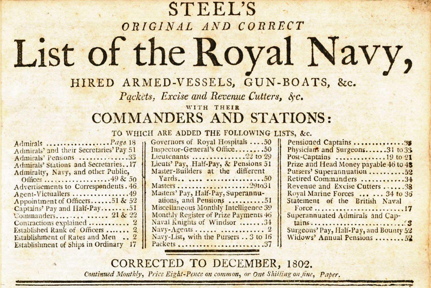Steel, a nautical bookseller in London, had recognized a demand for up-to-the-minute information about Royal Navy ships and personnel. His unofficial lists appeared from 1780 to 1816 and proved a popular and invaluable resource throughout the wars with France and America. The earliest productions were little more than thin pamphlets, comprising an inventory of ships with the number of their guns, the names of their commanders, and an indication of whether the vessels were in commission, out of service, or under construction. By the 1790s, the lists also gave the locations of home and foreign stations, a record of vessels taken by or from the enemy, the identity of officers who had perished in the service of their country, the launch or acquirement date of each ship, and the names of the Lords of the Admiralty, Commissioners of the Navy and Navy agents, post captains, commanders, lieutenants, masters, surgeons, and officers of the Royal Marines. During the wars with France and America, Steel’s list appeared at the beginning of every month. Although unofficial, Steel’s list was accounted both accurate and trustworthy. It was not until the beginning of 1814 that the Admiralty itself began producing anything comparable, issued from Albemarle Street in London by Jane Austen’s publisher, John Murray.
