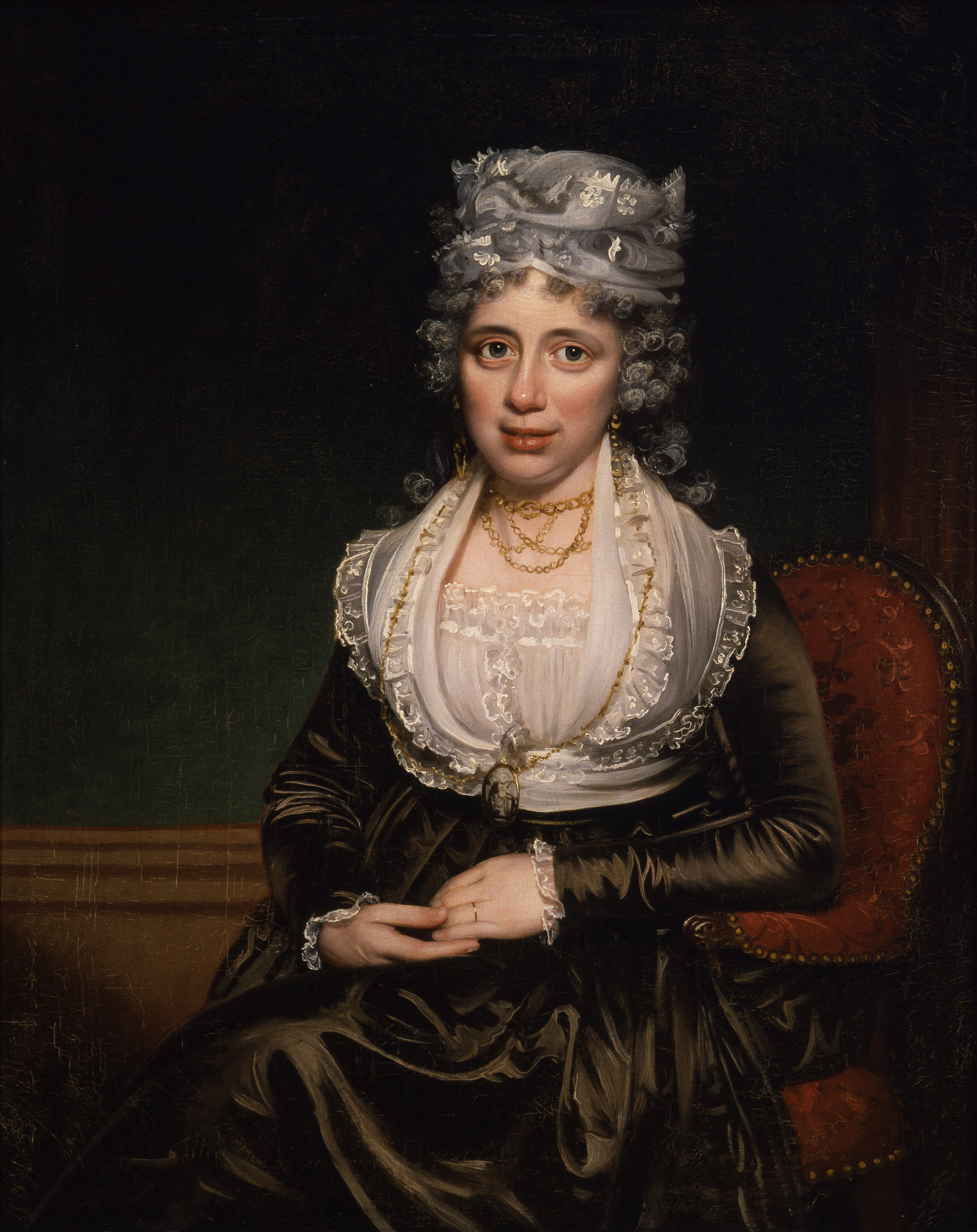 Elizabeth Coburn Courtney of South Carolina wears a mourning pendant with imagery similar to that in mourning needleworks in her c. 1795 portrait by James Earl. DAR Museum 71.100.