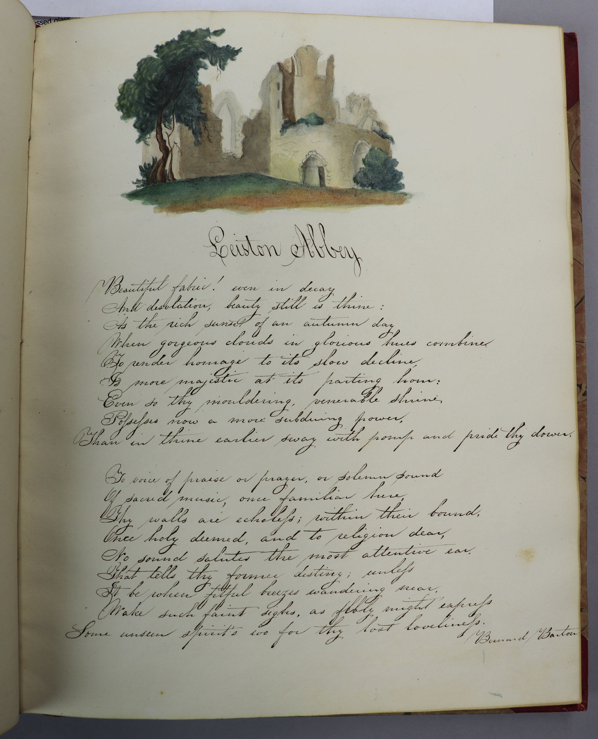 Many girls and women kept copy books in which they wrote excerpts of poetry and other works, adding watercolors and sketches; one kept by Quaker Elizabeth Margaret Chandler, a published poet and an abolitionist, suggests that gothic topics had wide appeal. One sketch depicts a woman seated in a picturesque setting, including a blasted tree. Another copies the first stanzas of an 1820 poem by a fellow Quaker, Bernard Barton, illustrated with a picturesque ruin that resembles the real Leiston Abbey, though an illustrated edition of Barton’s poetry that might have inspired Chandler cannot be located. Rebecca Rooker, a recent English immigrant to Maryland, made a masterful needlework copy of a print of a ruined church in about 1810. Prints of gothic scenes, too, would have hung on American walls.