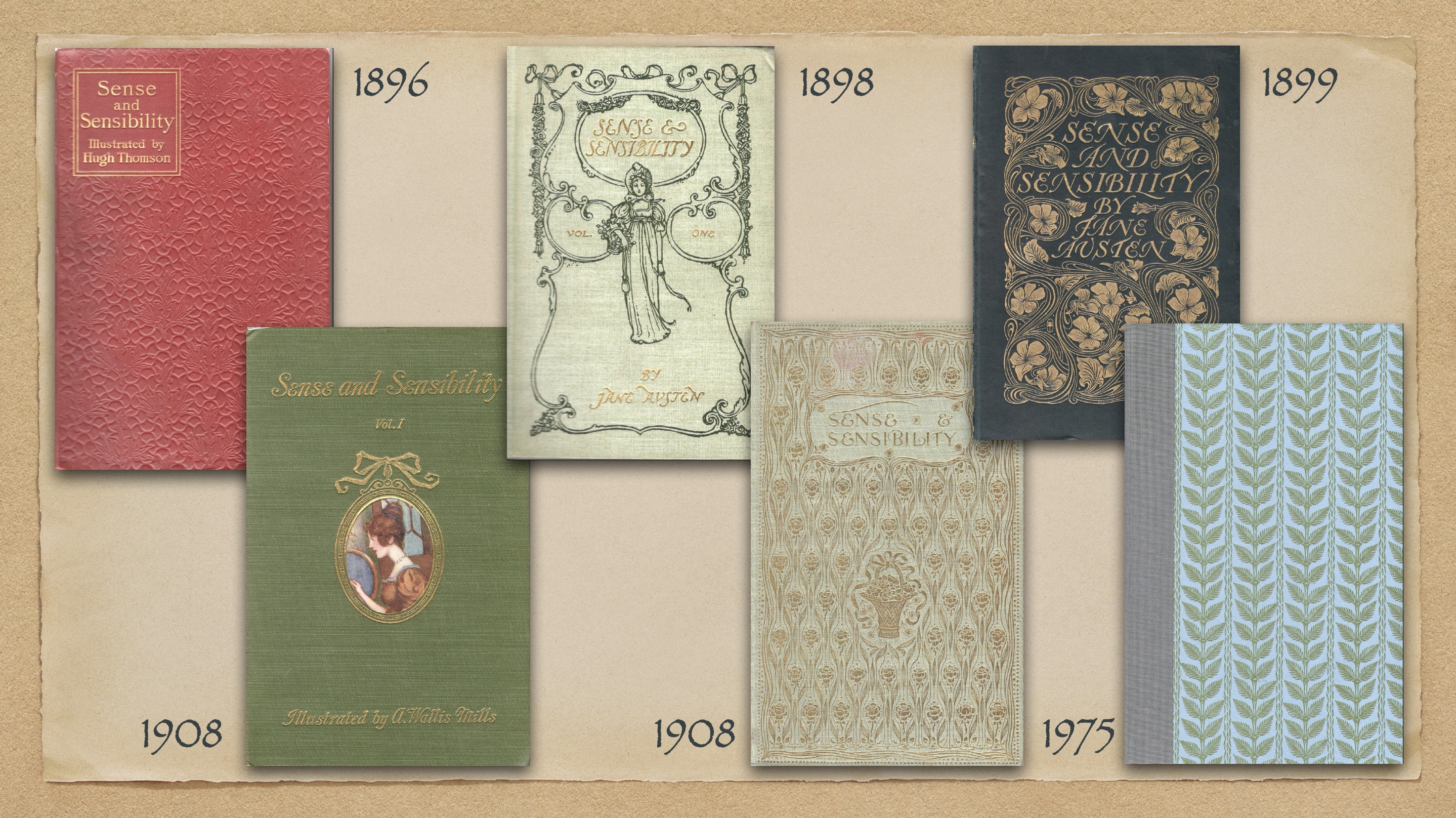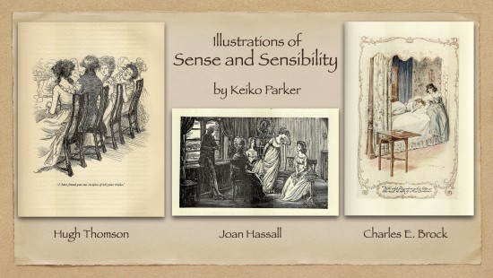 This essay focuses on the six editions of Sense and Sensibility (shown above) from my library: illustrated by (from top left to right) Hugh Thomson in the “Illustrated Standard Novels” (pen and ink drawings, Macmillan), Charles E. Brock (lithographs, ten vols., Dent), and Chris Hammond in the “Cranford Series” (pen and ink drawings, George Allen), and (below) A. Wallis Mills (watercolors, ten vols., Chatto & Windus), Charles E. Brock in the “English Idylls” series (watercolors, six vols. among other writers’ works, Dent), and Joan Hassall (wood-engravings, seven vols., The Folio Society).